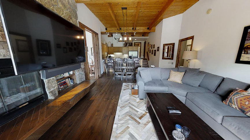 Our family room offers a comfortable respite from a full day on the mountain skiing, hiking or on the river fly-fishing. Kick your feet up and throw a blanket over you on our cozy sectional couch that comfortably seats 8. After the stunning sunset right out of the western facing triple panned sliders, turn on the gas fireplace with the flip of a switch. Enjoy the 65 inch TV to watch your favorite Apple TV movie/show or watch those videos from the days adventure or just play your favorite music though the Sonos sound system with your favorite cocktail or glass of wine. Between the sectional and the Pottery Barn genuine leather recliner arm chair the room comfortably accommodates 9 adults making it a perfect place to tell stories from the day or play one of the many games we have available to our guests.