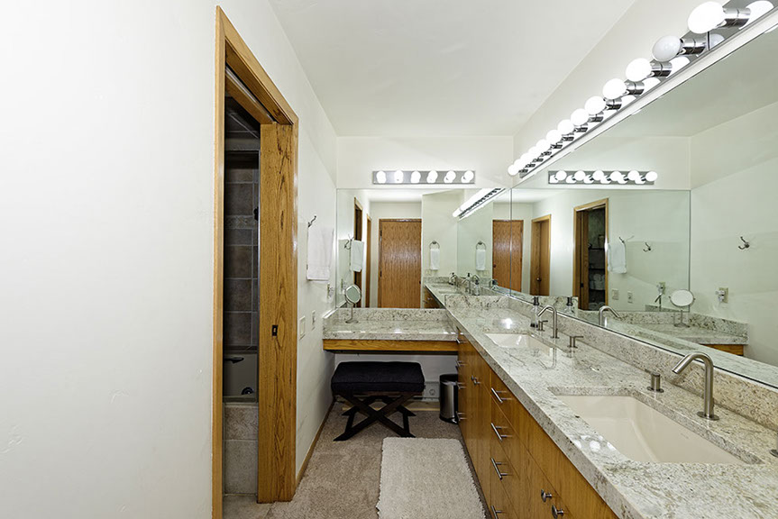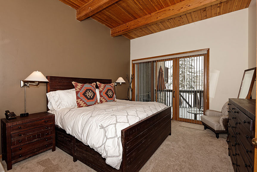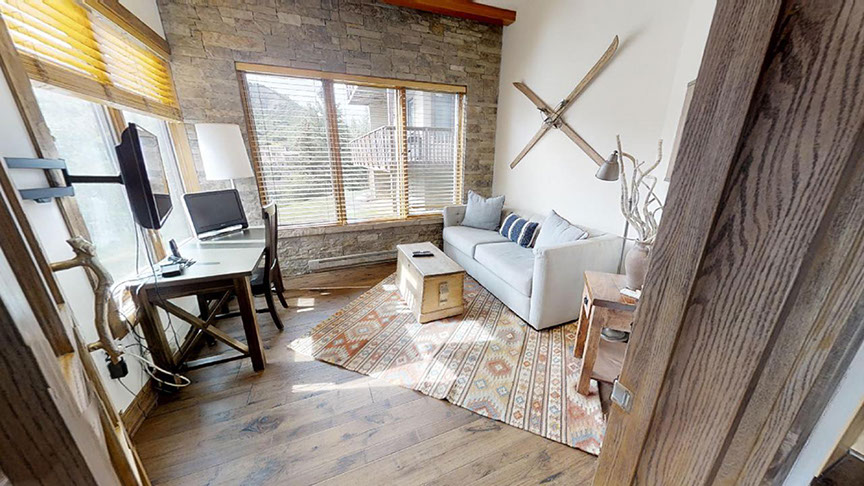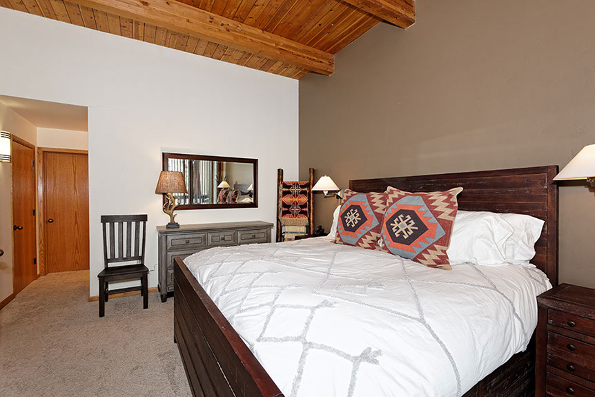 When its time to retire to rest up for the next days adventure the master bedroom with a king size bed and majestic views of Mt. Daly just outside the sliding glass doors will be much welcomed. Just outside the sliding glass doors there is an oversized balcony with ground level access (1 of only 4 residences with back yard access). The en-suite master bath has double sink vanity, sit down makeup counter and steam shower and tub. A walk-in closet 2 dressers, floor length mirror, armchair and ottoman and 45 inch TV rounds out this master for the most discerning of guests. The second master suite also offers a master bed (or two twins) with an en-suite bathroom with steam shower/tub, a dresser, large closet and flat panel tv. The third bedroom offers sweeping views from Snowmass Mountain, Mt. Daly and the entire valley. Sunlight abounds with two walls of windows. This room is flexible and can be utilized as a great office/reading room or family room extension.