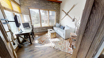 When its time to retire to rest up for the next days adventure the master bedroom with a king size bed and majestic views of Mt. Daly just outside the sliding glass doors will be much welcomed. Just outside the sliding glass doors there is an oversized balcony with ground level access (1 of only 4 residences with back yard access). The en-suite master bath has double sink vanity, sit down makeup counter and steam shower and tub. A walk-in closet 2 dressers, floor length mirror, armchair and ottoman and 45 inch TV rounds out this master for the most discerning of guests. The second master suite also offers a master bed (or two twins) with an en-suite bathroom with steam shower/tub, a dresser, large closet and flat panel tv. The third bedroom offers sweeping views from Snowmass Mountain, Mt. Daly and the entire valley. Sunlight abounds with two walls of windows. This room is flexible and can be utilized as a great office/reading room or family room extension.